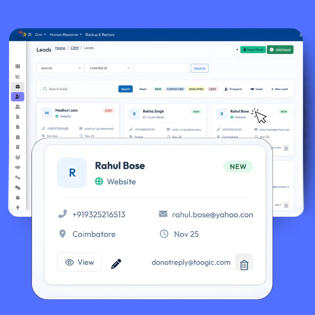 Our CRM software is built to simplify lead management, automate sales processes, and strengthen customer relationships. Designed for businesses of all sizes, it helps you track every lead, close deals faster, and boost overall sales performance. With advanced analytics, multi-channel integration, and smart automation — Toogic CRM turns your data into growth.